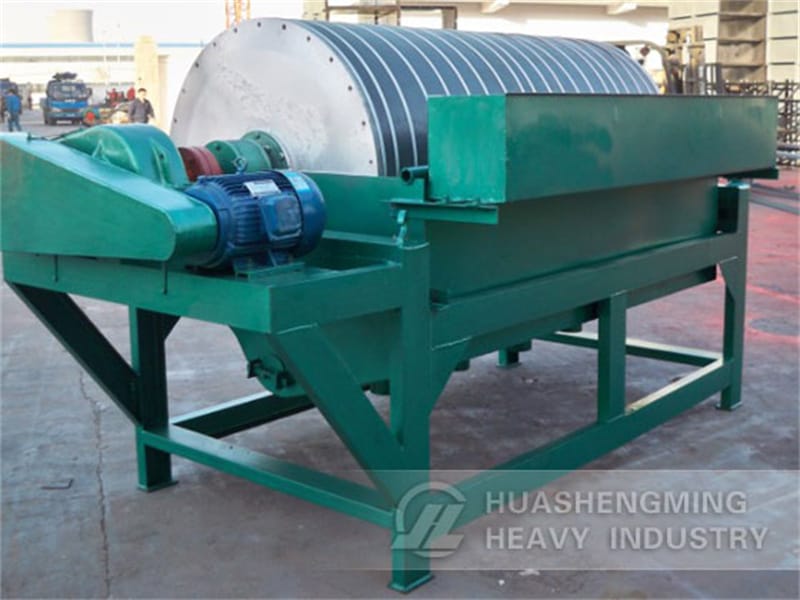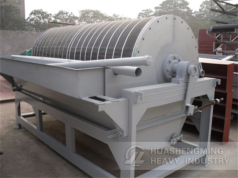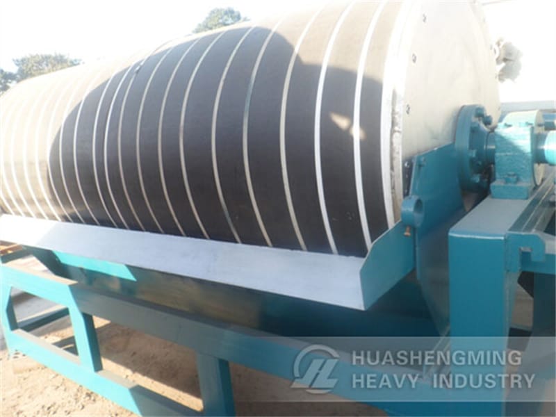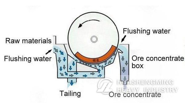 Slurry enters chute through ore tank, and then gets into separating zone by waterpower. Minerals with strong magnetism is absorbed on the barrel’s surface under the force of magnetic field and get into the ore concentrate outlet along with the rotation of cylinder. After leaving the magnetic field, they flow into ore concentrate box by the action of gravity and flushing water. Gangue and ore with weak magnetism are discharged into a pipe in the opposite direction of cylinder rotation.