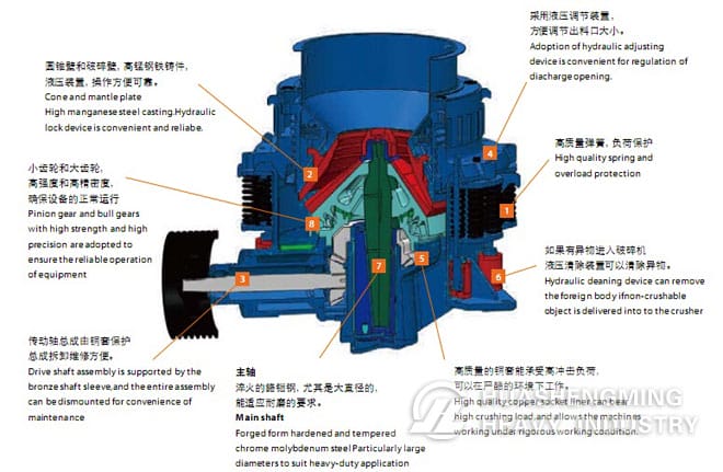 When the cone crusher begins to work, the electric motor drives the eccentric sleeve through the spring coupling, drive shaft and a pair of angle gear, so that the crushing wall of cone crusher gets close to and then gets away from the surface of the rolling mortar wall fixed on the adjusting sleeve, and the ores inside the crushing chamber will be constantly impacted, squeezed and bent to be crushed.